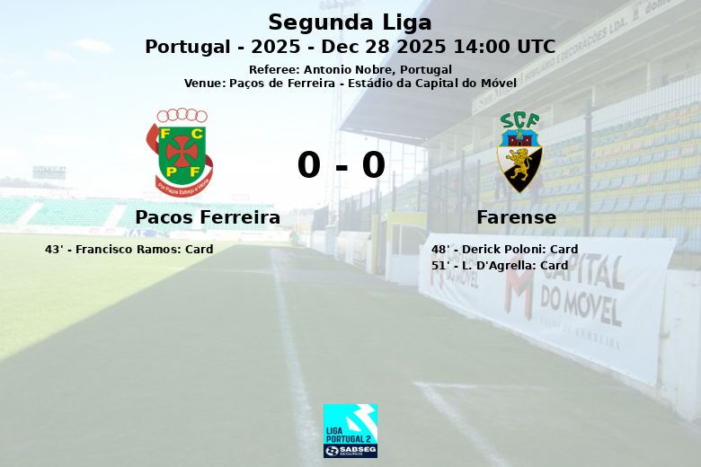 Paços de Ferreira, Portugal – Le match d’aujourd’hui à l’Estádio da Capital do Móvel, comptant pour la 16e journée de la Segunda Liga portugaise, entre Paços de Ferreira et Farense, a été marqué par une intensité dans le jeu et la discipline. L’arbitre Antonio Nobre, du Portugal, a dû distribuer des cartons jaunes à plusieurs reprises. Francisco Ramos, de Paços Ferreira, a reçu un avertissement à la 43e minute. Par la suite, Farense a vu Derick Poloni (48e minute) et L. D’Agrella (51e minute) être avertis. Malgré l’intensité sur le terrain, le match est resté dans les limites du fair-play, aucun carton rouge n’ayant été distribué à l’une ou l’autre équipe. La possession du ballon et les tirs cadrés et non cadrés n’ont pas pu être déterminés. Le match s’est déroulé dans le cadre de la saison 2025.