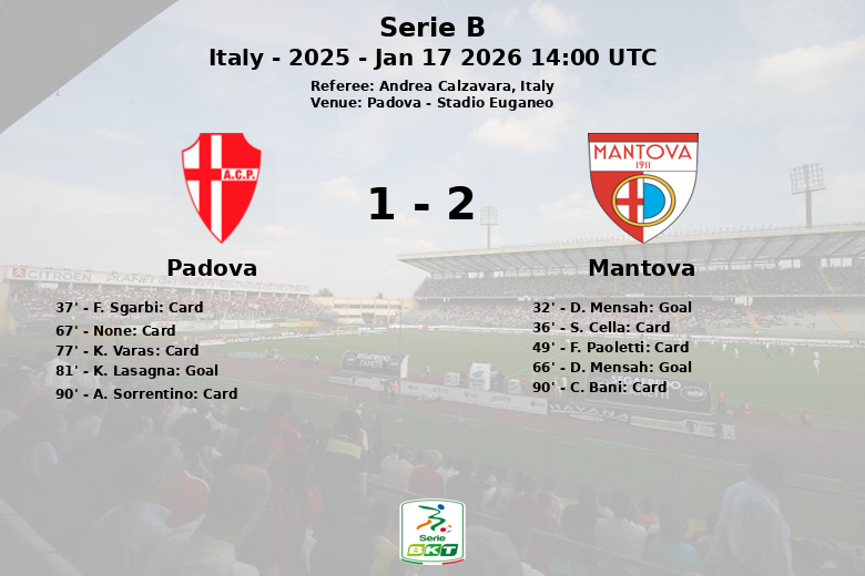 Mantova a pris l’avantage grâce à un doublé de D. Mensah (minutes 32 et 66), sur des passes décisives de N. Radaelli et S. Trimboli respectivement. Cependant, Padova, qui a dominé la possession avec 57 %, s’est battu pour revenir dans le match et a finalement trouvé le but par l’intermédiaire de K. Lasagna à la 81e minute, sur une passe décisive de A. Capelli, égalisant le score.