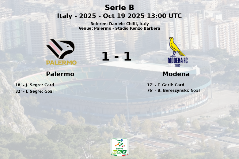 Palerme a pris l’avantage à la 32e minute grâce à un but de J. Segre, donnant l’avantage à l’équipe locale. Cependant, Modène n’a pas abandonné et a cherché sans relâche l’égalisation. Leur effort a été récompensé à la 76e minute lorsqu’un but contre son camp de B. Bereszynski a égalisé le score.