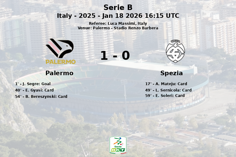 Palerme, Italie – Dans un match serré comptant pour la 20e journée de Serie B, Palerme a remporté une victoire à domicile contre Spezia, au Stadio Renzo Barbera. Le seul but du match, marqué par J. Segre dès la première minute, sur une passe décisive de J. Pohjanpalo, s’est avéré suffisant pour assurer les trois points à l’équipe locale.