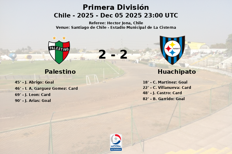 Un match vibrant s’est déroulé à l’Estadio Municipal de La Cisterna à Santiago du Chili, où Palestino et Huachipato ont fait match nul dans un match plein d’émotion et de rebondissements. Huachipato a ouvert le score à la 18e minute avec un but de C. Martinez, après une action sans passe décisive. Palestino a réagi avant la mi-temps, égalisant à la 45e minute grâce à J. Abrigo.