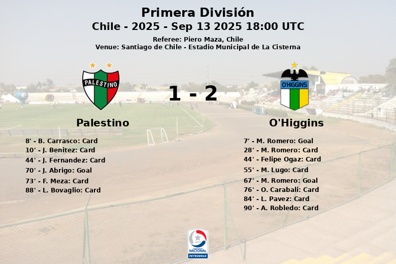 Santiago de Chile, 13 septembre 2025 – Dans un match acharné au stade Municipal de La Cisterna, Palestino et O’Higgins ont fait match nul dans une rencontre marquée par les cartons jaunes et les batailles au milieu de terrain. L’arbitre Piero Maza a passé une soirée chargée, distribuant un total de dix cartons jaunes.