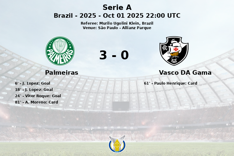 Bien que Vasco da Gama ait tenté de réagir, leur possession de balle (57%) ne s’est pas traduite par des occasions de but claires. L’équipe visiteuse n’a réussi que 3 tirs cadrés sur 9 tentatives au total. Palmeiras, en revanche, a été plus efficace, transformant 3 de ses 6 tirs cadrés en buts. Le match a été caractérisé par un jeu disputé, avec un total de 21 fautes commises par les deux équipes. Paulo Henrique de Vasco da Gama a reçu un carton jaune à la 61e minute, tandis que A. Moreno de Palmeiras a été averti à la 81e minute. Palmeiras remporte les trois points dans un match où son efficacité et sa solidité défensive ont été déterminantes.