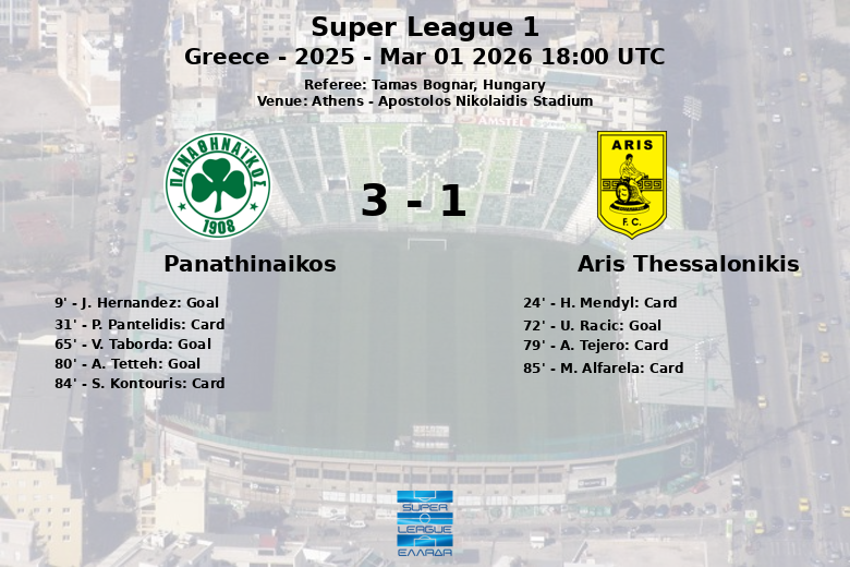 Le Panathinaikos a ouvert le score rapidement, à la 9e minute, avec un but de J. Hernandez, assisté par P. Pantelidis. L’Aris, bien que conservant le contrôle du ballon, n’a pas réussi à concrétiser ses occasions. La première mi-temps a également été marquée par des cartons jaunes pour H. Mendyl de l’Aris à la 24e minute et pour P. Pantelidis du Panathinaikos à la 31e minute.
