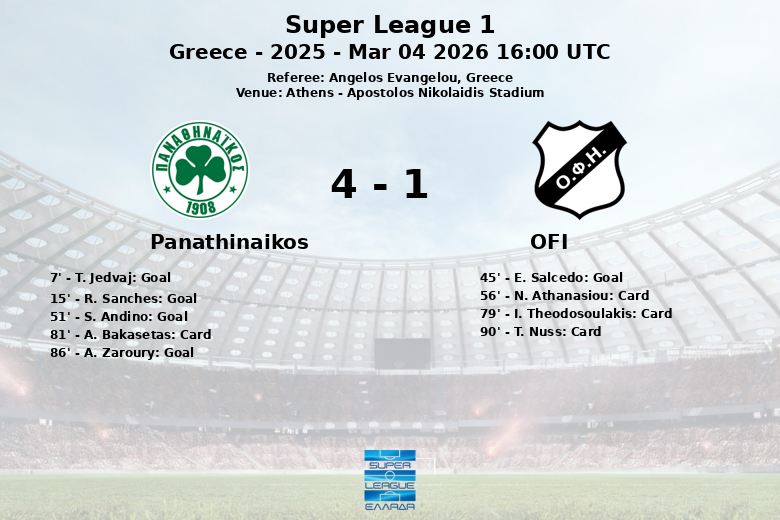Athènes, Grèce – Le Panathinaikos a offert une démonstration retentissante de puissance offensive en battant l’OFI au stade Apostolos Nikolaidis dans le cadre de la Super League 1. Le match, joué le 4 mars 2026, s’est terminé par un score favorable à l’équipe locale.