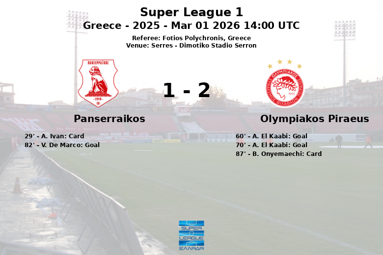 Le match, correspondant à la 23e journée de la Super League 1 grecque, a vu l’Olympiakos ouvrir le score à la 60e minute avec un but de A. El Kaabi, assisté par Rodinei. A. El Kaabi lui-même a ensuite augmenté l’avance dix minutes plus tard, à la 70e minute, grâce à une passe décisive de G. Martins.
