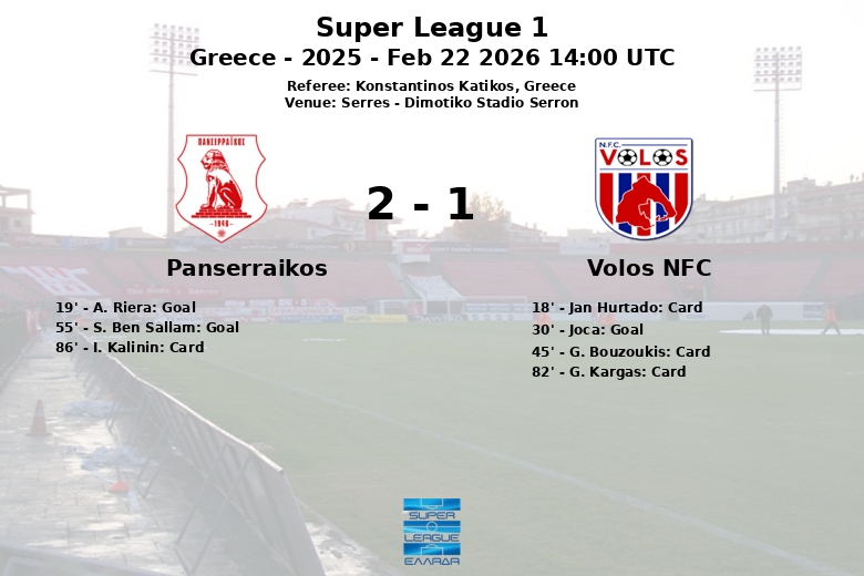 Panserraikos a ouvert le score à la 19e minute avec un but de A. Riera, assisté par Alex Teixeira. Cependant, Volos NFC a répondu à la 30e minute avec un but de Joca, assisté par G. Bouzoukis. En seconde période, S. Ben Sallam a redonné l’avantage à Panserraikos à la 55e minute, de nouveau assisté par A. Riera.