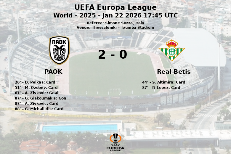 Dans un match disputé au stade Toumba de Thessalonique, le PAOK a remporté la victoire contre le Real Betis avec un score final de deux à zéro. Le match, comptant pour la phase de groupes de l’UEFA Europa League, a été marqué par l’intensité et les batailles au milieu de terrain.