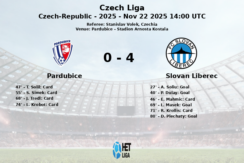 Pardubice, République Tchèque – Dans un match disputé au Stadion Arnosta Kostala, le Slovan Liberec s’est imposé avec autorité face à Pardubice, démontrant clairement sa supériorité offensive. La rencontre, comptant pour la 16e journée de la Ligue Tchèque, s’est soldée par une large victoire de l’équipe visiteuse.