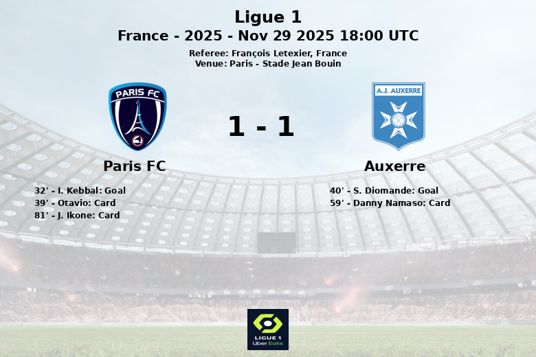 Le match s’est enflammé à la 32e minute lorsque I. Kebbal a transformé un penalty en faveur du Paris FC, leur donnant l’avantage initial. Cependant, Auxerre a réagi peu après, à la 40e minute, avec un but de S. Diomande, assisté par L. Sinayoko, égalisant le score avant la mi-temps.