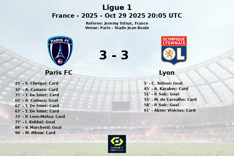 Paris, France – Dans un match électrisant qui s’est déroulé au Stade Jean Bouin, le Paris FC et Lyon ont fait match nul, terminant avec un score de Paris FC 3 – Lyon 3. Ce match, comptant pour la dixième journée de Ligue 1, a été marqué par l’intensité et la controverse arbitrale.