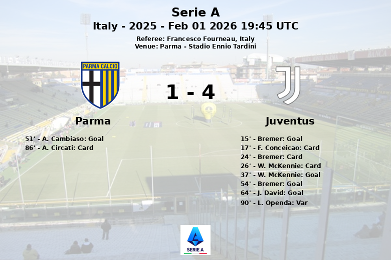 En seconde période, Parme a tenté de réagir, mais un but contre son camp de A. Cambiaso à la 51e minute, sans assistance, a encore compliqué leurs chances. La Juventus a continué à presser et Bremer a marqué à nouveau à la 54e minute, cette fois assisté par J. David. J. David a également trouvé le chemin des filets à la 64e minute, sans assistance.