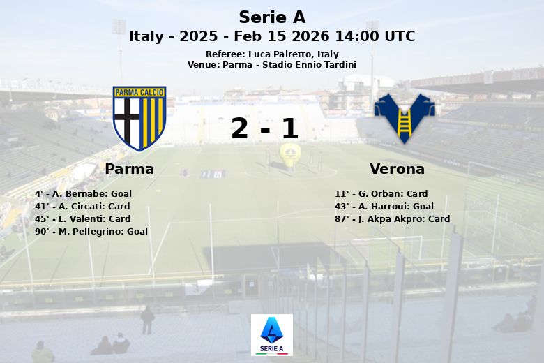 A. Bernabé a donné l’avantage à Parme à la 4e minute avec un but suite à une passe décisive de M. Keita. Cependant, la joie des locaux a été contrée par le but sur penalty d’A. Harroui pour Vérone à la 43e minute, égalisant le match juste avant la mi-temps.