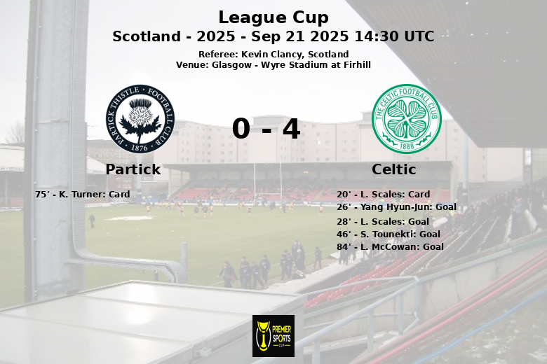 Glasgow, Écosse – Le Celtic a assuré sa place en demi-finale de la Coupe de la Ligue avec une victoire convaincante contre Partick au Wyre Stadium at Firhill. Le match, arbitré par Kevin Clancy, a vu le Celtic imposer son jeu dès le début.