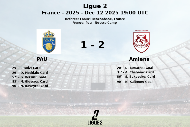 Pau et Amiens ont fait match nul lors d’un match acharné au Nouste Camp, lors de la 17e journée de Ligue 2. Le match, arbitré par Faouzi Benchabane, a été marqué par l’intensité et des interruptions constantes.