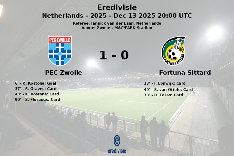 Zwolle, Pays-Bas – Lors d’un match disputé au MAC³PARK Stadion, le PEC Zwolle s’est imposé face au Fortuna Sittard dans une rencontre marquée par l’intensité et les cartons jaunes. Le but de K. Kostons à la 6ème minute, sur une passe décisive de S. Shoretire, a donné l’avantage précoce à l’équipe locale.