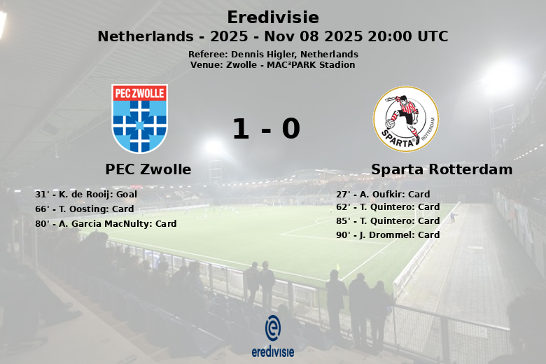 Le match a été interrompu par de nombreuses fautes (14 du Sparta Rotterdam et 9 du PEC Zwolle) et cartons. Le Sparta Rotterdam a accumulé quatre cartons jaunes (A. Oufkir, T. Quintero à deux reprises et J. Drommel) et un carton rouge pour T. Quintero à la 85e minute. Le PEC Zwolle a reçu deux cartons jaunes (T. Oosting et A. Garcia MacNulty). Malgré sa supériorité en termes de possession et de tirs, le Sparta Rotterdam n’a pas pu égaliser et est reparti de Zwolle les mains vides. Le PEC Zwolle a célébré une importante victoire devant son public.