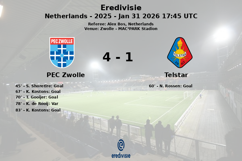 Le PEC Zwolle a ouvert le score à la 45e minute grâce à un but de S. Shoretire, sur une passe de S. Graves. Cependant, le Telstar a réagi au début de la seconde période, égalisant le match à la 60e minute avec un but de N. Rossen. La joie des visiteurs fut de courte durée, puisque K. Kostons a redonné l’avantage au PEC Zwolle à la 67e minute. Peu après, à la 70e minute, T. Gooijer a creusé l’écart pour l’équipe locale, sur une passe de Kostons. Un but de K. de Rooij a été annulé pour hors-jeu à la 78e minute. Finalement, K. Kostons a scellé le match à la 83e minute, grâce à une passe décisive de K. de Rooij.