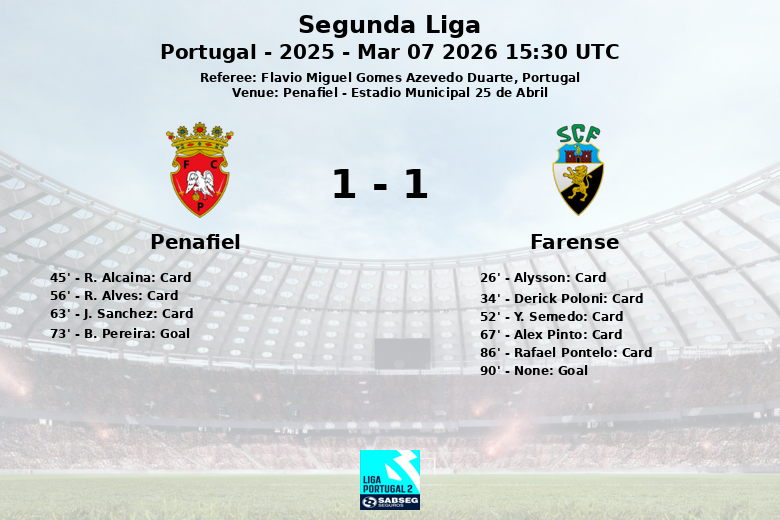 La seconde mi-temps est devenue encore plus difficile pour Farense lorsque Y. Semedo a reçu un carton rouge à la 52e minute. Malgré le fait de jouer à dix, Farense a résisté jusqu’à ce que B. Pereira marque pour Penafiel à la 73e minute. Cependant, Farense a réussi à égaliser dans la dernière minute du match.