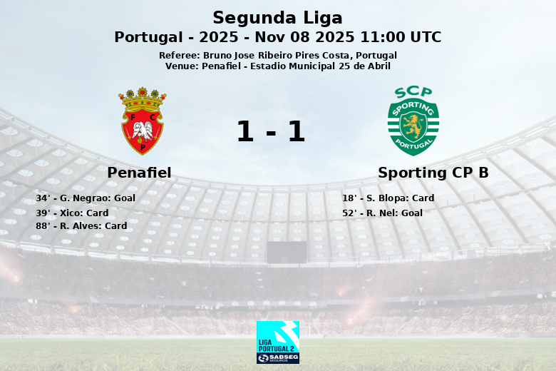 Penafiel et le Sporting CP B ont fait match nul dans un match disputé qui s’est tenu à l’Estadio Municipal 25 de Abril. Le match, arbitré par Bruno Jose Ribeiro Pires Costa, dans le cadre de la 11e journée de la Segunda Liga portugaise, a été marqué par des moments de tension et des buts qui ont tenu les supporters en haleine.