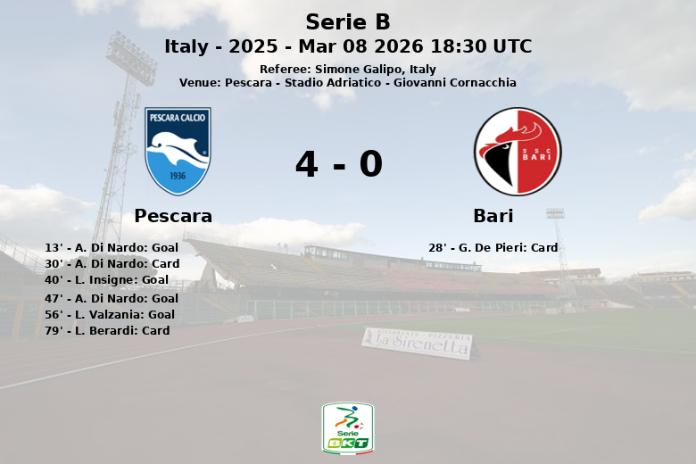 Le score a été ouvert tôt, à la 13e minute, avec un but d’A. Di Nardo, assisté par A. Cagnano. Bari a tenté de réagir, mais son jeu a été interrompu par un carton jaune infligé à G. De Pieri à la 28e minute. Pescara a également écopé d’un avertissement à A. Di Nardo à la 30e minute. Avant la pause, L. Insigne a creusé l’écart pour Pescara en transformant un penalty à la 40e minute.