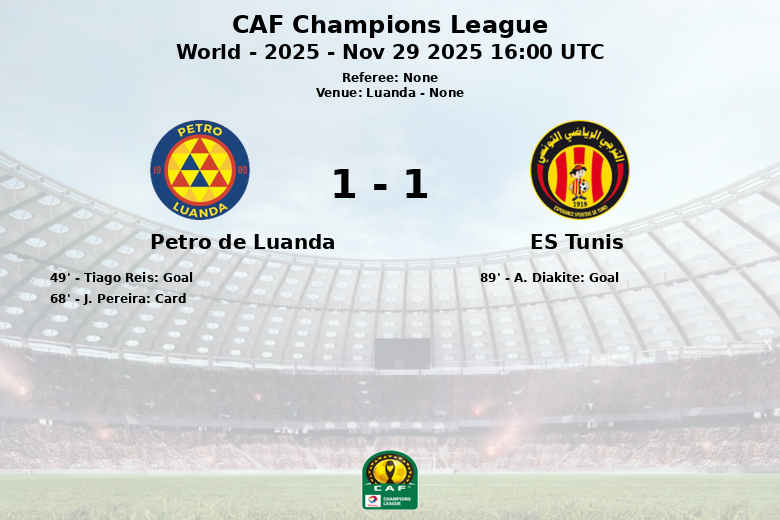 Petro de Luanda a pris l’avantage à la 49e minute grâce à un but de Tiago Reis, sur une passe décisive de J. Pereira. Cependant, ES Tunis n’a pas abandonné et a cherché avec insistance l’égalisation, qui est finalement intervenue à la 89e minute par l’intermédiaire de A. Diakite, qui a reçu une passe décisive de M. Ben Hamida.