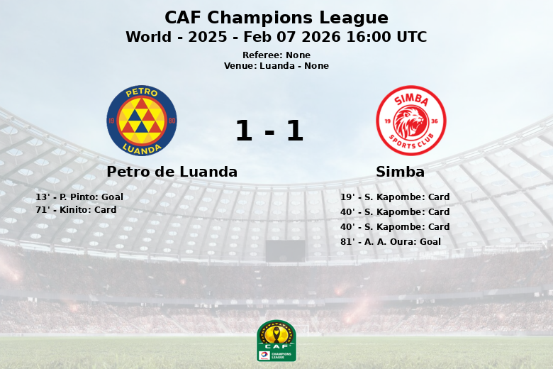Luanda, 7 février 2026 – Petro de Luanda et Simba SC ont fait match nul lors d’un match de la Ligue des Champions de la CAF marqué par l’intensité et la discipline. Petro a dominé la possession avec 64%, reflétant son contrôle du jeu pendant une grande partie de la rencontre. P. Pinto a donné l’avantage à l’équipe locale à la 13e minute, grâce à une passe décisive de Benny, déclenchant la joie dans les tribunes.