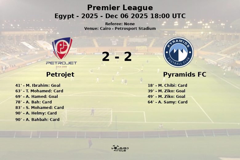 Le score a été ouvert à la 39e minute grâce à un but de M. Ziko de Pyramids FC, sur une passe décisive de M. Chibi. La joie fut de courte durée, car à la 41e minute, M. Ibrahim a égalisé pour Petrojet sur une passe de B. Moussa. La deuxième mi-temps a continué avec la même intensité, et M. Ziko a de nouveau donné l’avantage à Pyramids FC à la 49e minute. Alors qu’il semblait que Pyramids FC allait remporter la victoire, un penalty transformé par A. Hamed à la 69e minute a offert l’égalisation définitive à Petrojet.