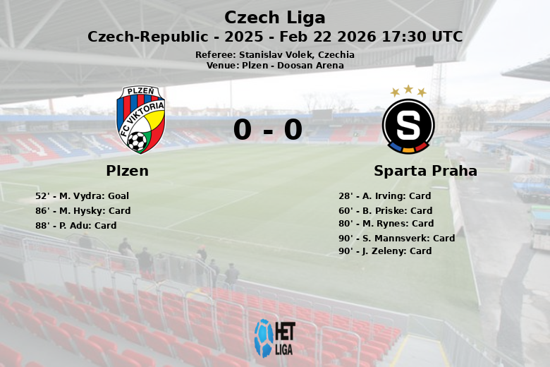 Plzen a subi un revers à la 52e minute lorsque M. Vydra a manqué un penalty, bien qu’il ait ensuite réussi à marquer dans la même action. Le match a été caractérisé par un jeu physique, mis en évidence par les nombreux cartons jaunes distribués par l’arbitre Stanislav Volek. Le Sparta Praha a accumulé quatre avertissements, tandis que Plzen en a reçu un.