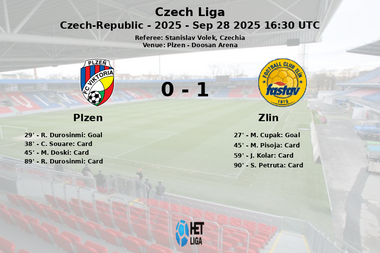 Remplacements dans l’quipe de zlin: À la 63e minute, S. Kanu est entré et T. Poznar est sorti., À la 74e minute, M. Pisoja est entré et S. Petruta est sorti., À la 74e minute, C. Nombil est entré et T. Ulbrich est sorti., À la 83e minute, J. Kalabiska est entré et A. Krapka est sorti., À la 83e minute, J. Didiba est entré et D. Machalik est sorti.