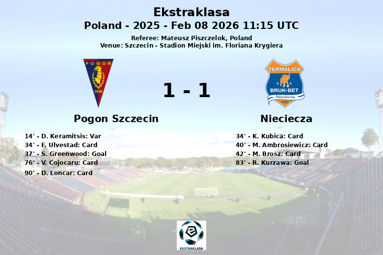 En seconde période, Nieciecza a cherché avec insistance l’égalisation, générant de nombreuses occasions de marquer. Finalement, R. Kurzawa a égalisé à la 83e minute, scellant le match nul final. Pogon Szczecin a fait preuve d’une plus grande précision dans ses tirs au but (6 sur 17) que Nieciecza (7 sur 21). L’arbitre Mateusz Piszczelok a distribué un total de 5 cartons jaunes, 3 pour Pogon Szczecin et 2 pour Nieciecza.
