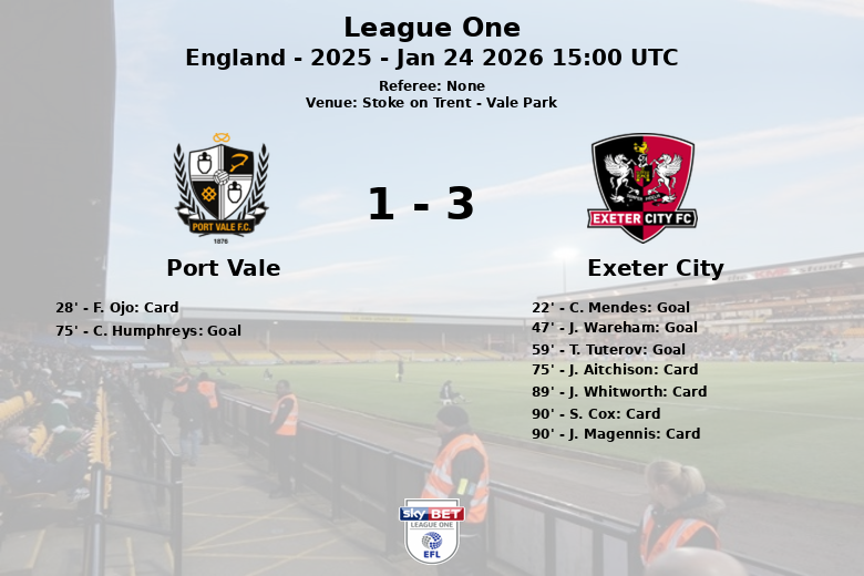 Stoke on Trent, Angleterre – Lors d’un match disputé à Vale Park, Exeter City a vaincu de manière convaincante Port Vale lors de la 28e journée de League One. La rencontre, suivie de près par les supporters, s’est terminée par un score favorable à Exeter City.