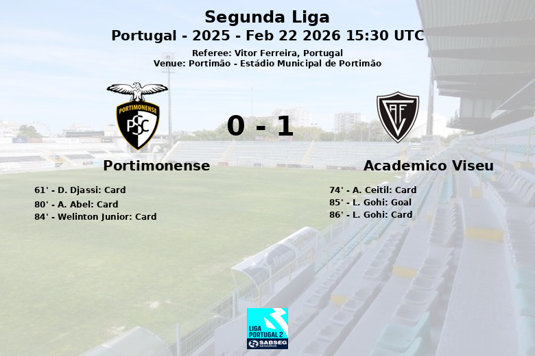 Le match s’est échauffé avec une série de cartons jaunes distribués aux joueurs des deux équipes. L’Academico Viseu a finalement trouvé l’ouverture à la 85e minute, lorsque L. Gohi, servi par N. Mortimer, a réussi à battre le gardien local. La joie du but a été rapidement suivie d’un carton jaune pour Gohi lui-même. Portimonense a désespérément cherché l’égalisation dans les dernières minutes, mais n’a pas réussi à concrétiser ses efforts.