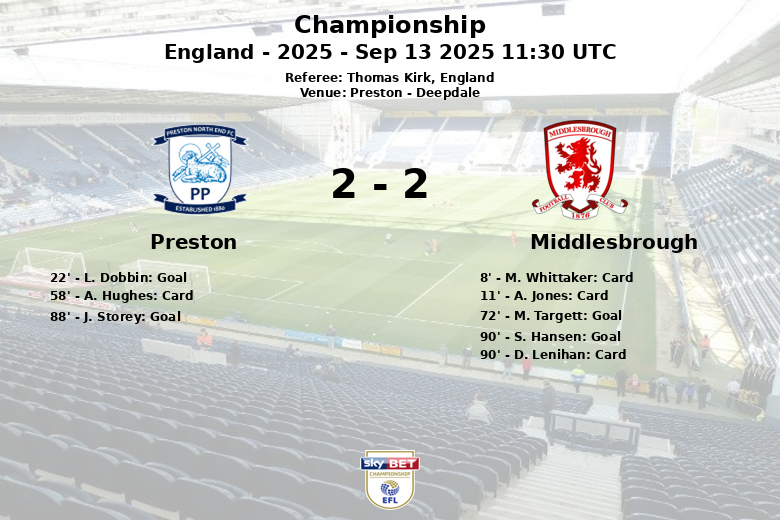 Preston a pris l’avantage à la 22e minute grâce à un but de L. Dobbin, sur une passe décisive de J. Storey. Cependant, Middlesbrough n’a pas abandonné et a égalisé à la 72e minute grâce à un but de M. Targett, sur une passe décisive de T. Conway. La joie de l’égalisation fut de courte durée pour les visiteurs, car J. Storey a redonné l’avantage à Preston à la 88e minute, cette fois grâce à une passe décisive de B. Whiteman.