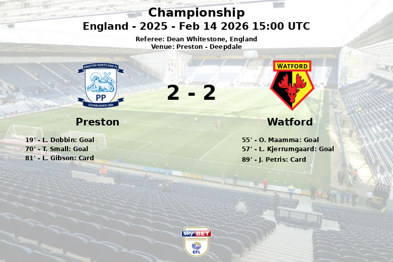 Preston, Angleterre – Lors d’un match vibrant disputé à Deepdale, Preston et Watford ont fait match nul dans une rencontre pleine de rebondissements et de buts. L’équipe locale a pris l’avantage à la 19e minute grâce à un but de L. Dobbin, sur une passe de B. Whiteman, déclenchant l’euphorie dans les tribunes.