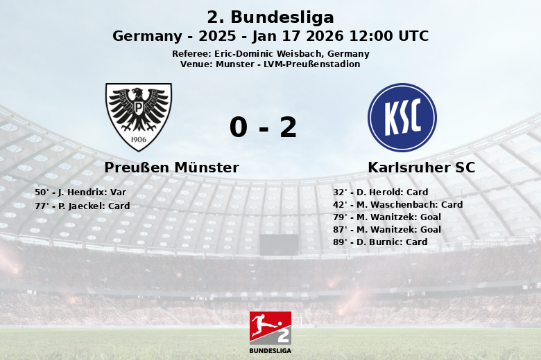 Münster, Allemagne – Un match acharné au LVM-Preußenstadion a vu le Karlsruher SC vaincre le Preußen Münster sur le score de 2 à 0, dans un match de 2. Bundesliga marqué par l’intensité et la controverse. Malgré la domination de Preußen Münster en termes de possession de balle (63%), le Karlsruher SC a su saisir ses opportunités, faisant preuve d’une grande efficacité. Le match, arbitré par Eric-Dominic Weisbach, a été rempli de tension dès le début, avec plusieurs cartons jaunes montrés aux joueurs du Karlsruher SC en première mi-temps (Herold à la 32e minute et Waschenbach à la 42e minute).
