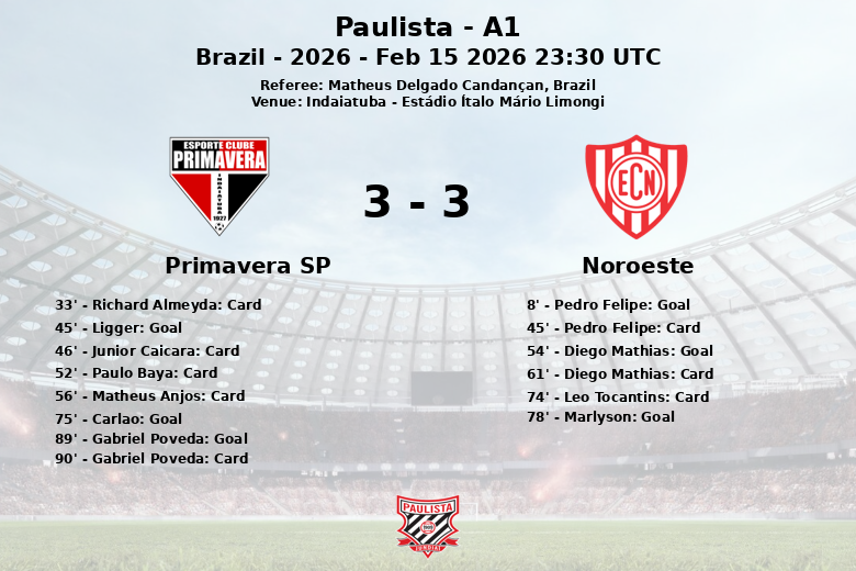 Noroeste a ouvert le score tôt, à la 8ème minute, grâce à un but de Pedro Felipe assisté par Diego Mathias. Primavera SP a répondu juste avant la mi-temps, à la 45ème minute, avec un but de Ligger. La deuxième mi-temps a vu Noroeste reprendre l’avantage avec un but de Diego Mathias à la 54ème minute. Un but contre son camp de Carlao à la 75ème minute a creusé l’écart pour Noroeste. Malgré le but de Marlyson à la 78ème minute et un autre but de Gabriel Poveda pour Primavera SP à la 89ème minute, le résultat final a été de 4-3 en faveur de Noroeste.