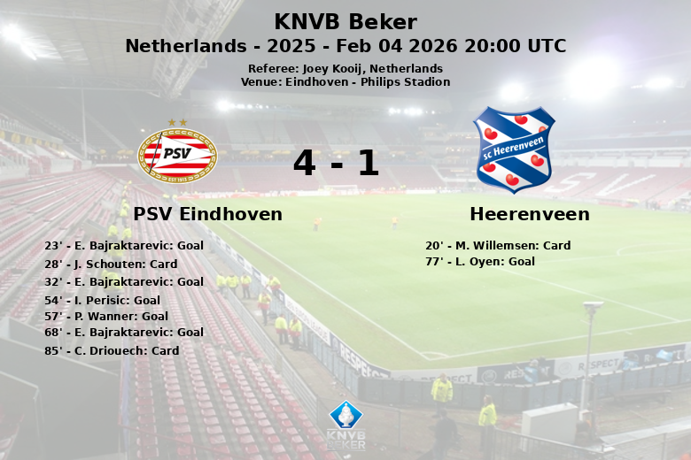 Ermin Bajraktarevic s’est révélé être la figure clé du match, marquant le premier but à la 23e minute et augmentant l’avance à la 32e minute. L’avalanche offensive du PSV s’est poursuivie en seconde période, avec des buts d’Ivan Perisic à la 54e minute et de Patrick Wanner à la 57e minute, consolidant la victoire. Bajraktarevic a eu l’occasion de réaliser un coup du chapeau, mais a manqué un penalty à la 68e minute. Heerenveen a réduit l’écart à la 77e minute grâce à un but de Luuk Oyen, mais cela n’a pas suffi à changer le cours du match.
