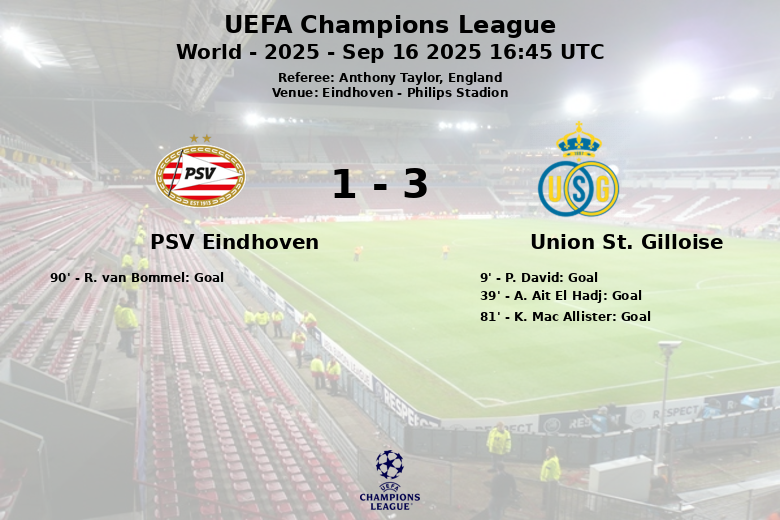En seconde période, l’Union Saint-Gilloise a continué à presser et, à la 81e minute, K. Mac Allister a marqué le troisième but, sur une passe décisive de K. Rodriguez, scellant apparemment le match. Le PSV a réussi à marquer à la 90e minute grâce à R. van Bommel, mais il était trop tard pour changer le résultat.