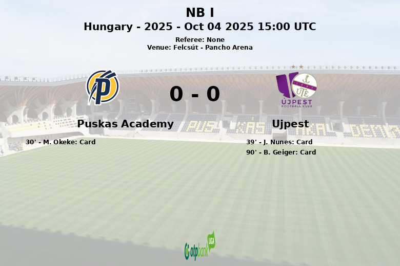 Le match a été interrompu par plusieurs fautes, 12 commises par Puskas Academy et 6 par Újpest. L’arbitre a montré un carton jaune à M. Okeke de Puskas Academy à la 30e minute, à J. Nunes d’Újpest à la 39e minute et à B. Geiger d’Ujpest à la 90e minute. Le score final reflète un match très tactique et disputé, bien qu’aucun but n’ait été marqué.