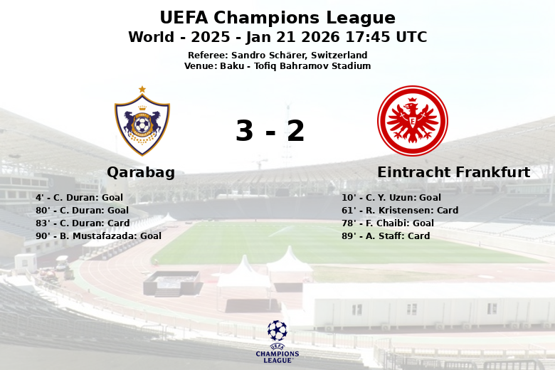 Bakou, le 21 janvier 2026 – Dans un match vibrant qui s’est déroulé au stade Tofiq Bahramov, le Qarabag FK a remporté une victoire importante sur l’Eintracht Francfort avec un score de 3 à 2. Ce match, comptant pour la phase de groupes de l’UEFA Champions League, a tenu les supporters en haleine jusqu’à la dernière minute.