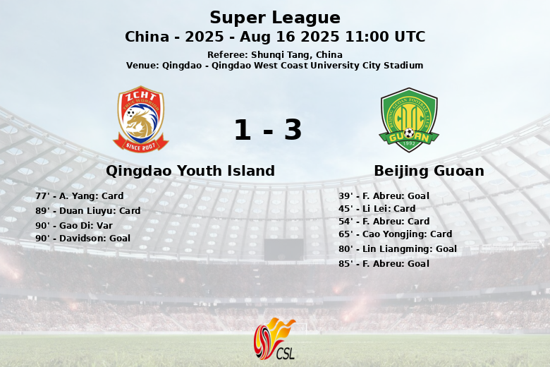 En seconde période, Lin Liangming a creusé l’écart pour Beijing Guoan à la 80e minute, sur une passe décisive de Zhang Xizhe, qui a également offert une passe décisive à F. Abreu pour son deuxième but du match à la 85e minute. Qingdao Youth Island a réussi à réduire l’écart grâce à un penalty transformé par Davidson dans le temps additionnel, après qu’un but de Gao Di ait été annulé par la VAR en raison d’une faute préalable.
