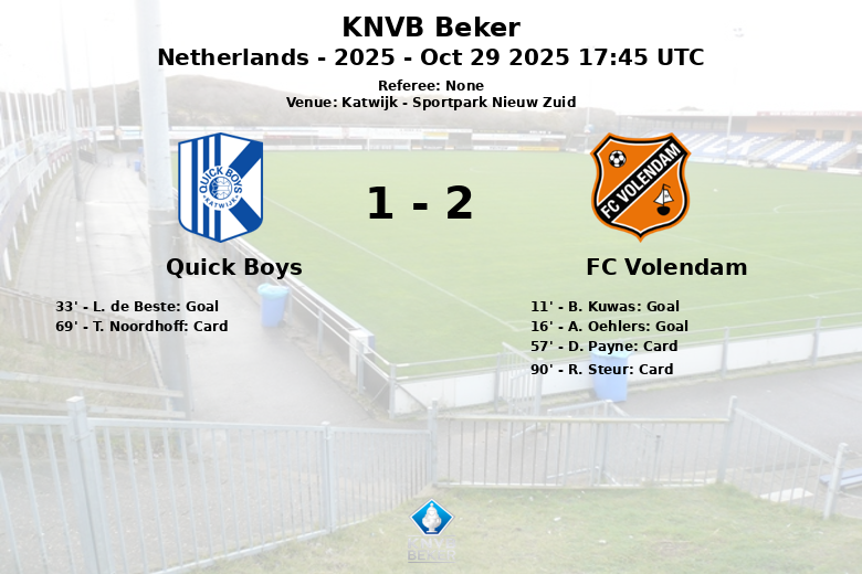 Katwijk, Pays-Bas – Le FC Volendam a remporté la victoire lors de son match contre Quick Boys au Sportpark Nieuw Zuid, dans le cadre du 2ème tour préliminaire de la KNVB Beker. Le match, disputé le 29 octobre 2025, a vu Volendam s’imposer avec un score qui reflète l’efficacité de son attaque.