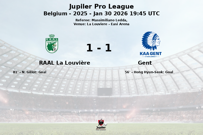 La Louviere, Belgique – Dans un match disputé à l’Easi Arena, RAAL La Louvière et Gent ont fait match nul lors de leur rencontre de Jupiler Pro League, comptant pour la journée 23 de la saison régulière. Le match, arbitré par Massimiliano Ledda, a été marqué par l’intensité et la bataille au milieu de terrain.