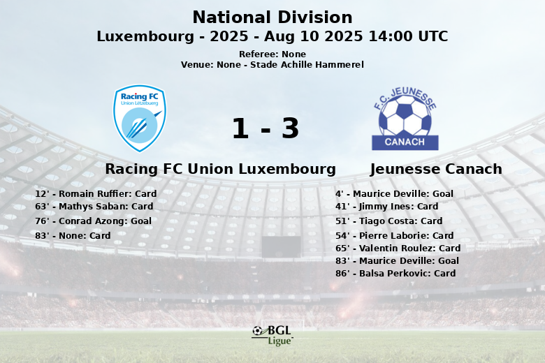 Le match disputé au Stade Achille Hammerel, comptant pour la deuxième journée de la National Division luxembourgeoise, s’est soldé par un nul vibrant. Jeunesse Canach a pris l’avantage dès la 4e minute grâce à un but de Maurice Deville. Cependant, le Racing FC Union Luxembourg a subi un coup dur à la 12e minute avec l’expulsion de Romain Ruffier.