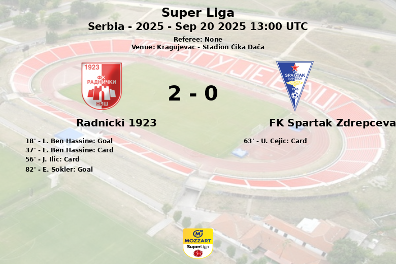 Le Radnicki 1923 a pris l’avantage à la 18e minute grâce à un penalty transformé par L. Ben Hassine, bien que le même joueur ait reçu un carton jaune peu après. Le FK Spartak Zdrepceva KRV a tenté de réagir, mais s’est heurté à une défense bien organisée.