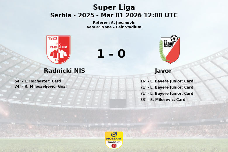 Radnicki Nis a vaincu Javor dans un match disputé au Cair Stadium, comptant pour la 25e journée de la Super Liga serbe. Le match, arbitré par S. Jovanovic, a été marqué par son intensité et les interruptions constantes.