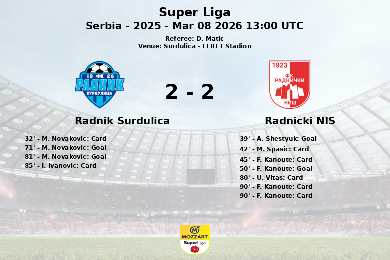 Radnicki Nis a pris l’avantage à la 39e minute grâce à un penalty transformé par A. Shestyuk, portant le score à 0-1. En seconde période, F. Kanoute a creusé l’écart pour Radnicki à la 50e minute, portant le score à 0-2. Cependant, Radnik Surdulica n’a pas abandonné et a réduit l’écart à la 71e minute grâce à un but de M. Novakovic, qui égalisera plus tard à la 81e minute sur un autre penalty.