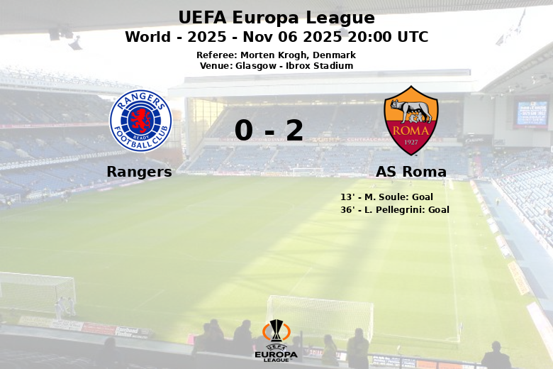 Glasgow, le 6 novembre 2025 – L’AS Roma a vaincu avec autorité les Rangers au Ibrox Stadium, lors d’un match comptant pour la phase de groupes de l’UEFA Europa League. L’équipe italienne, avec une possession de balle de 60 %, a contrôlé le rythme du jeu et a concrétisé sa domination au tableau d’affichage.
