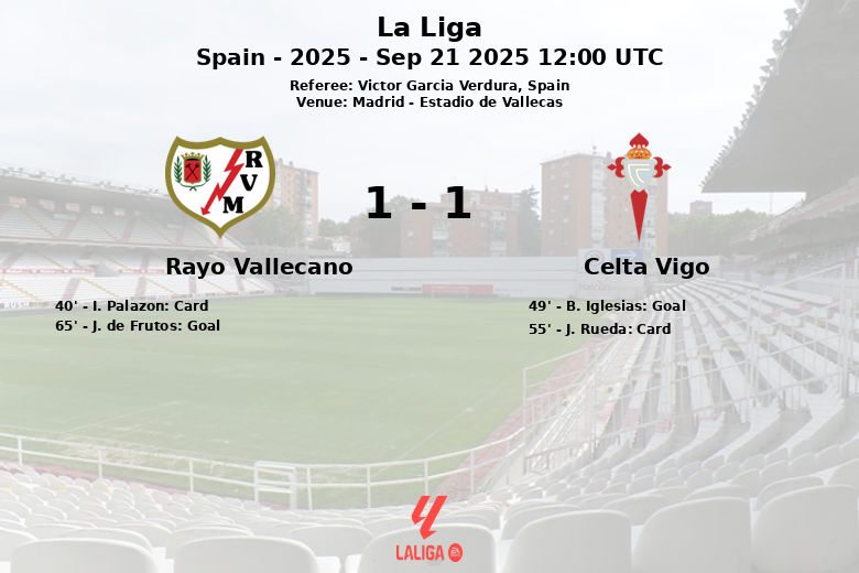 Le match a été marqué par l’intensité et les disputes au milieu de terrain. I. Palazon du Rayo Vallecano a reçu un carton jaune à la 40e minute, et J. Rueda du Celta Vigo en a reçu un à la 55e minute. En ce qui concerne les statistiques de tirs, le Rayo Vallecano a eu 14 tirs au total, dont 5 cadrés et 7 non cadrés. Le Celta Vigo a eu 9 tirs au total, 5 cadrés et 1 non cadré. Le Rayo Vallecano a eu 5 corners et le Celta Vigo 7.
